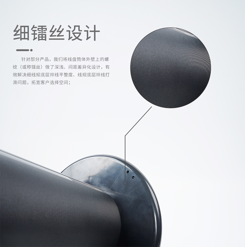 針對部分產(chǎn)品,我們將線盤筒體外壁上的螺紋(或稱鐳絲)做了深淺、間距差異化設(shè)計,有效解決細(xì)線規(guī)底層排線平整度、線規(guī)底層排線打滑問題,拓寬客戶選擇空間;