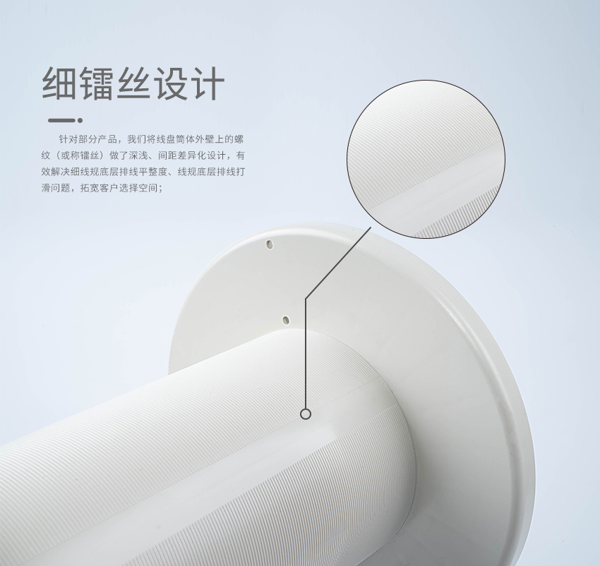 針對(duì)部分產(chǎn)品,我們將線盤筒體外壁上的螺紋(或稱鐳絲)做了深淺、間距差異化設(shè)計(jì),有效解決細(xì)線規(guī)底層排線平整度、線規(guī)底層排線打滑問題,拓寬客戶選擇空間;